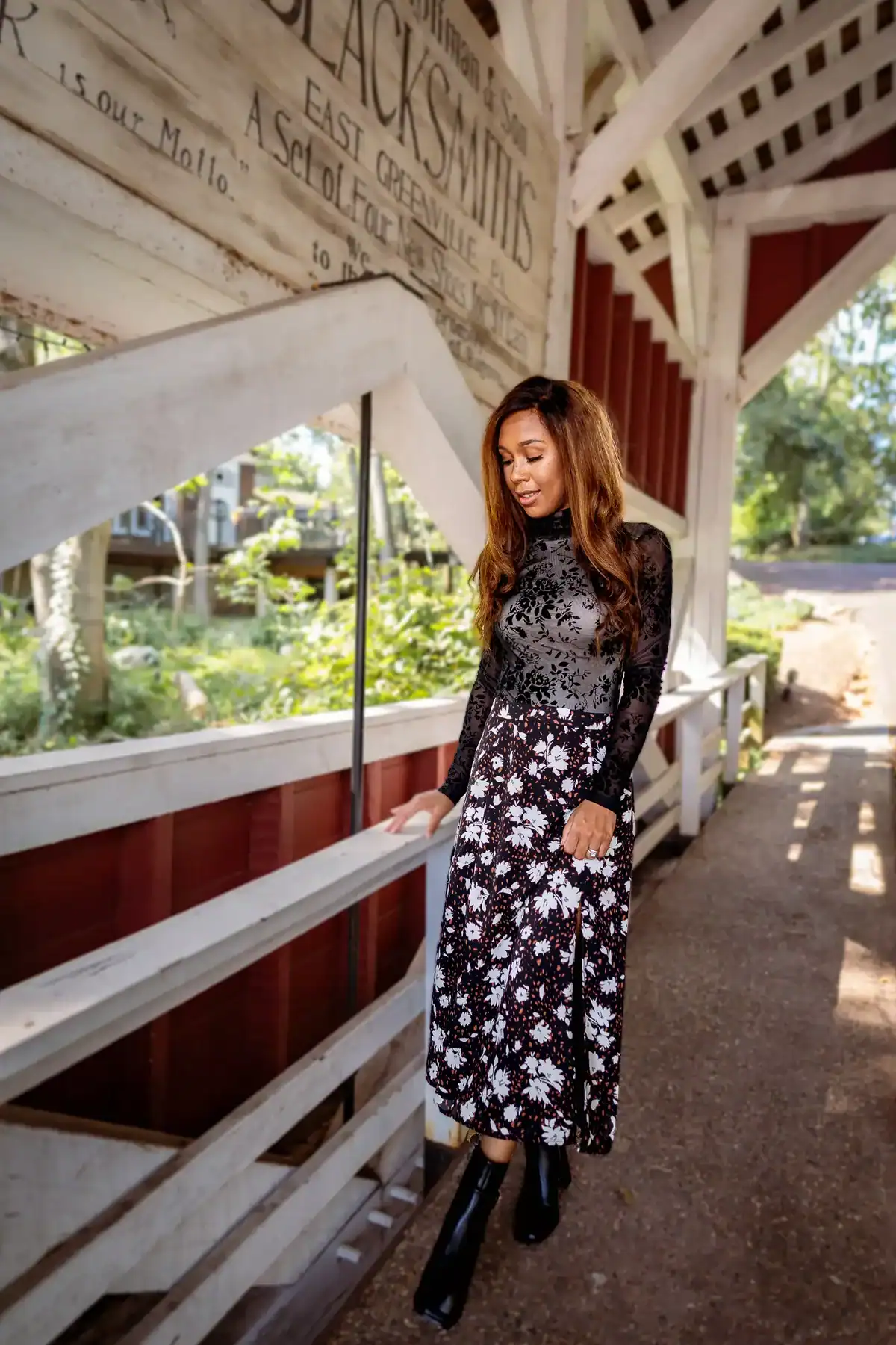 Embrace the essence of fall with this effortlessly chic ensemble that perfectly balances summer’s lingering warmth with autumn’s crisp air. The dark floral midi skirt, adorned with delicate white blooms, offers a romantic nod to the changing seasons.