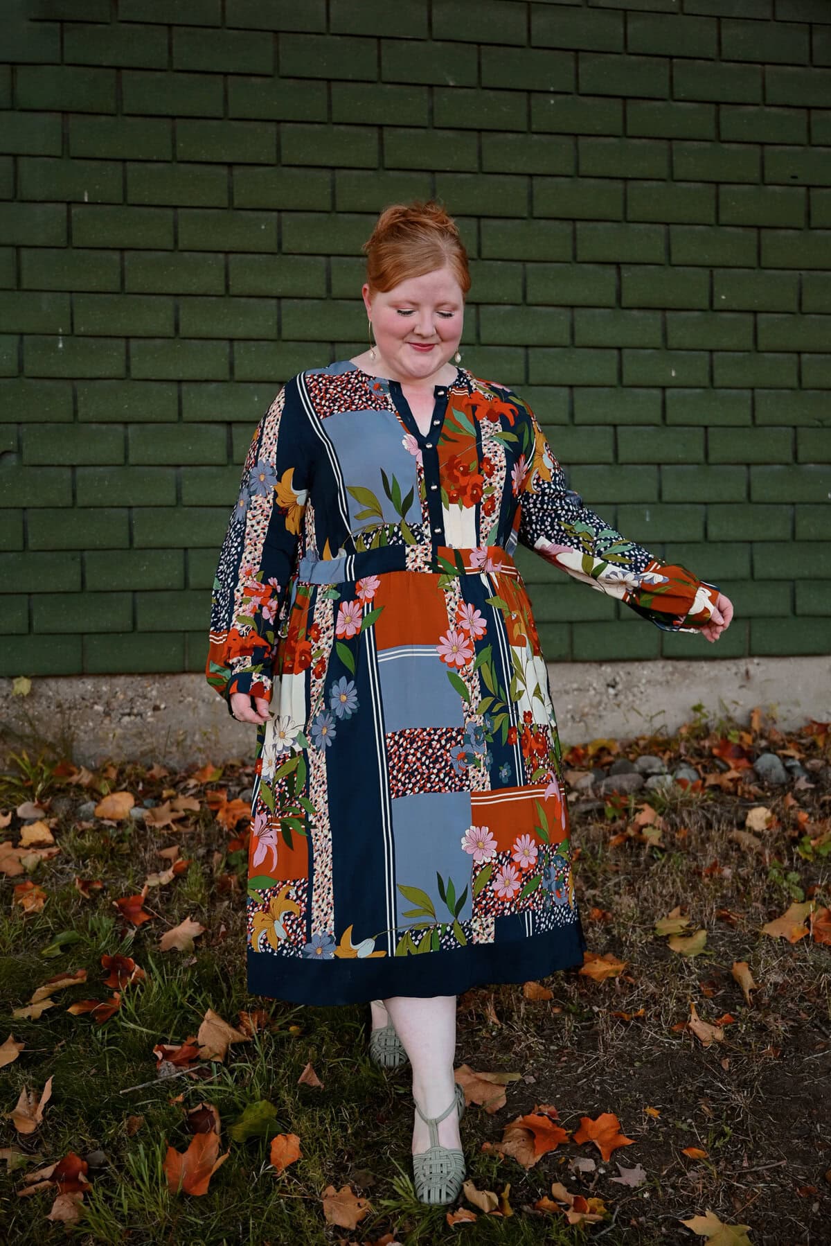 Embrace the rich colors of autumn with this eye-catching patchwork midi dress. The vibrant mix of floral prints, geometric patterns, and autumnal hues creates a stunning visual tapestry that captures the essence of fall.