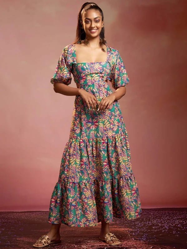 Make a vibrant statement on your special day with this eye-catching tropical print maxi dress. The square neckline and puff sleeves add a touch of vintage charm, while the tiered skirt creates a flattering silhouette thats perfect for dancing the night away.