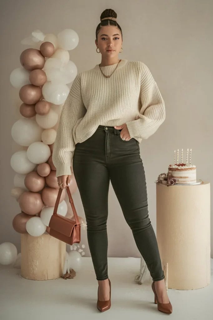 For a birthday celebration that exudes both comfort and style, this ensemble strikes the perfect balance. The oversized cream knit sweater paired with sleek olive-green skinny jeans creates a harmonious contrast of textures and colors.