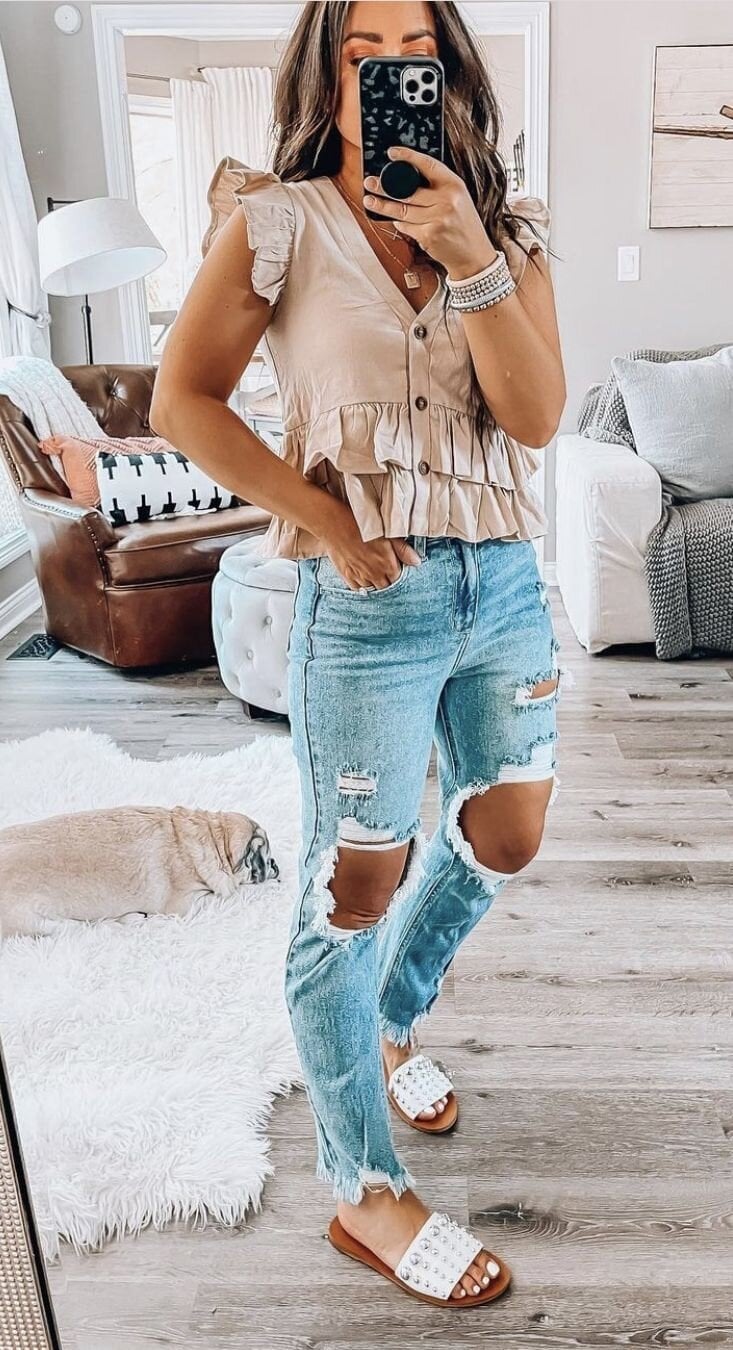 For a birthday look thats both trendy and laid-back, this outfit strikes the perfect balance. The soft beige ruffled blouse adds a touch of feminine charm with its delicate tiers and button-down front, while the distressed light-wash jeans bring an edgy, casual vibe.