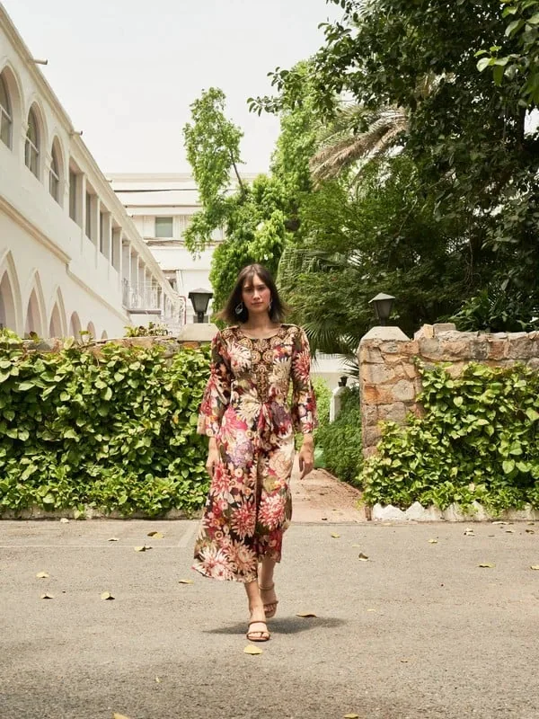 Make a statement on your birthday with this exquisite floral embroidered mini dress. The neutral beige base is adorned with vibrant, oversized flower motifs in coral, burgundy, and olive hues, creating a stunning bohemian-chic look.