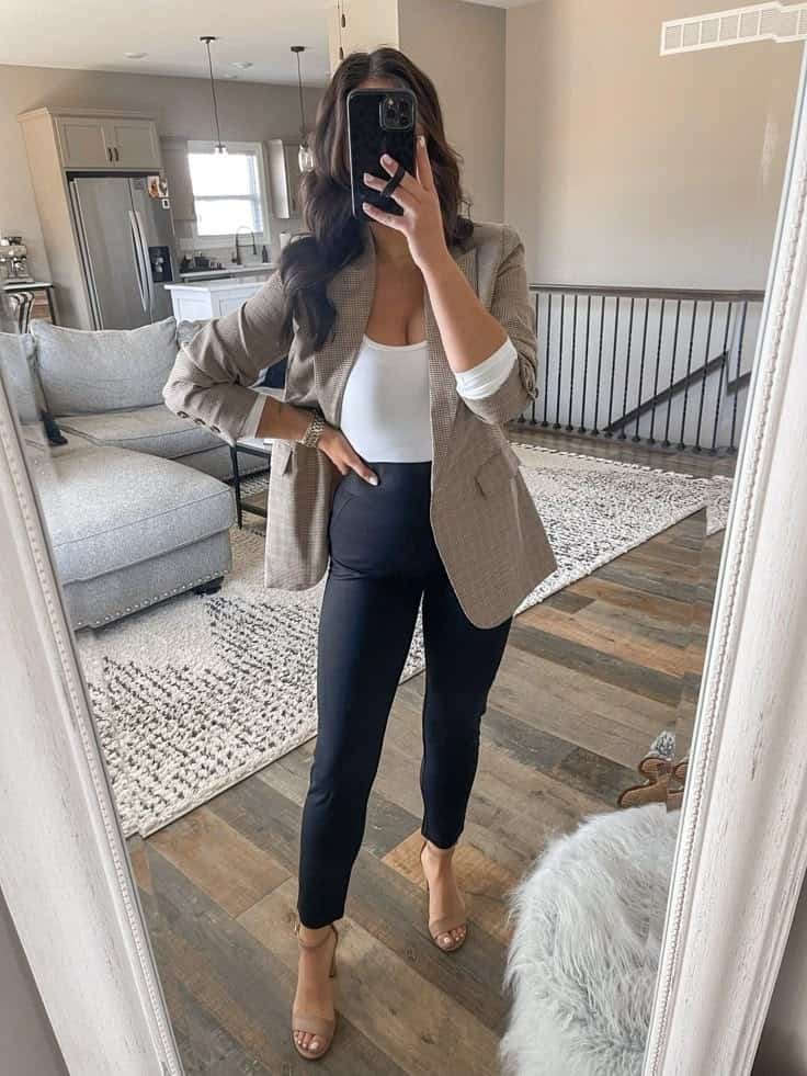 This outfit exemplifies effortless chic for the modern workplace. The neutral-toned plaid blazer adds structure and sophistication to a simple white tank top and black skinny pants combo.