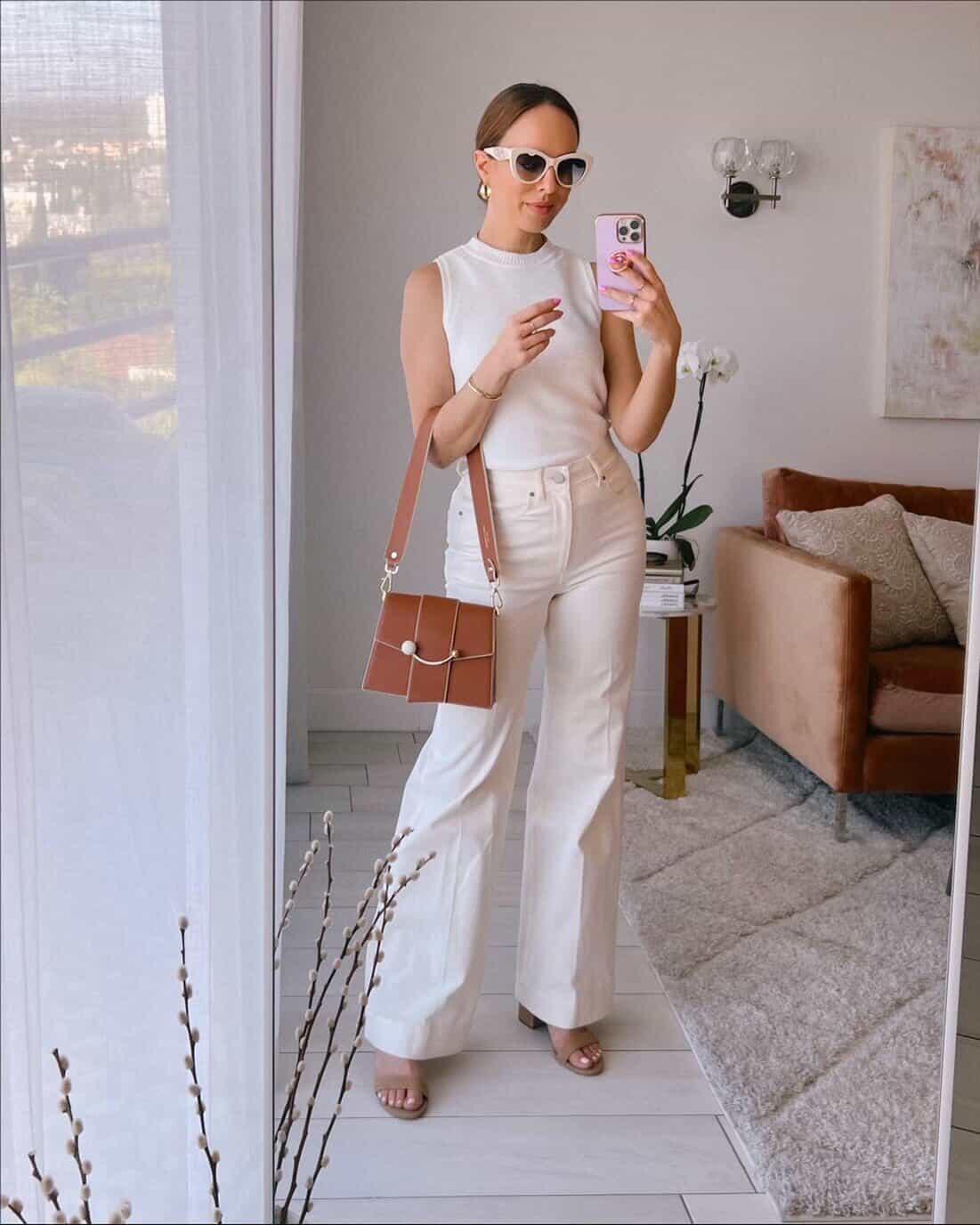 The contrast stitching on the jeans adds visual interest without being overly casual. Paired with pointed white flats and a structured white handbag, this ensemble strikes the perfect balance between comfort and style.