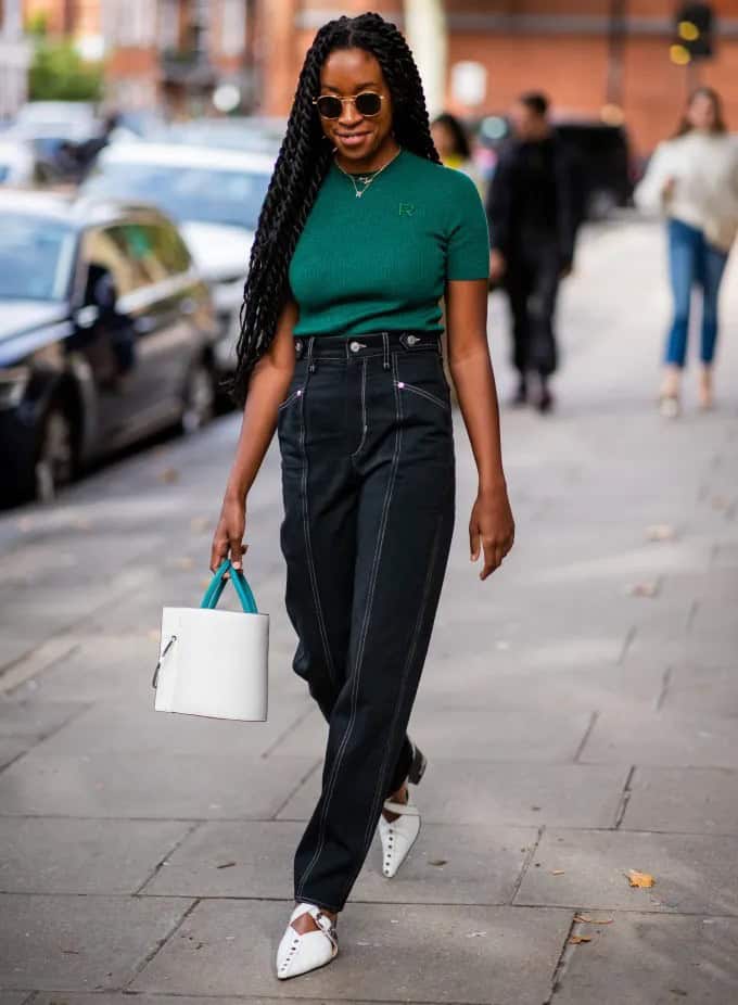 This outfit exemplifies effortless chic for the modern office. The emerald green fitted top adds a pop of color thats both vibrant and professional, while the high-waisted black jeans offer a sleek, elongating silhouette.