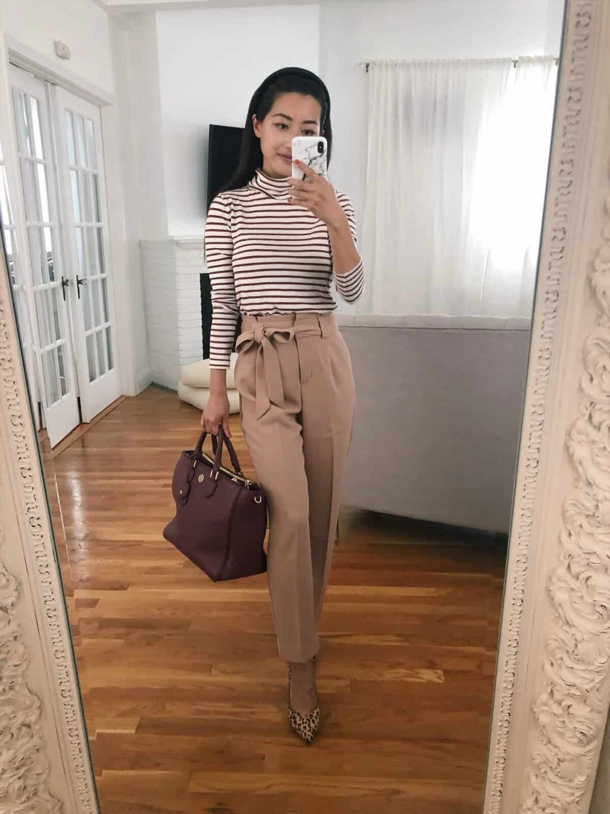 This ensemble seamlessly blends comfort with sophistication, making it an ideal choice for the modern office. The striped turtleneck adds a touch of timeless style, while the high-waisted trousers in a neutral tone create a sleek, elongated silhouette.