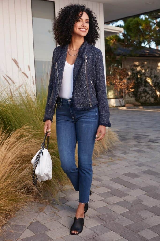 The jackets navy hue and subtle sparkle add a touch of refinement, making it perfect for a business casual environment. Cropped jeans and open-toe mules keep the outfit fresh and modern, while a white handbag adds a crisp contrast.