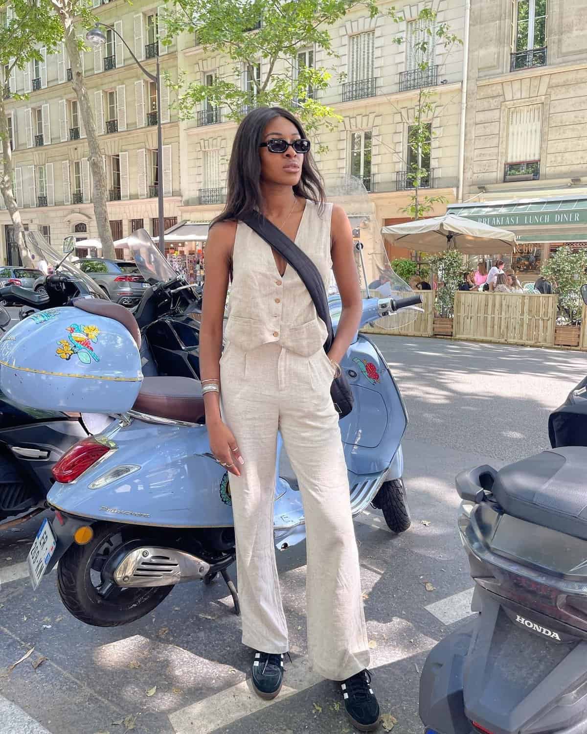 The sleeveless design and button-front detail add a touch of casual refinement, while the wide-leg silhouette ensures both style and ease of movement throughout your workday. Paired with sleek sneakers and oversized sunglasses, this outfit demonstrates how to seamlessly blend comfort with workplace polish.