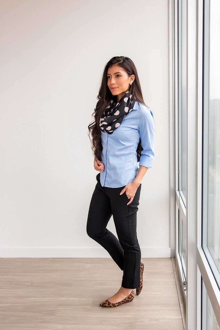 The outfit is elevated by thoughtful accessories: a polka dot scarf adds a touch of whimsy and visual interest, while leopard print flats introduce a hint of personality without compromising professionalism. This combination strikes an ideal balance between polished and approachable, demonstrating how simple pieces can be styled to create a sophisticated yet comfortable office look.