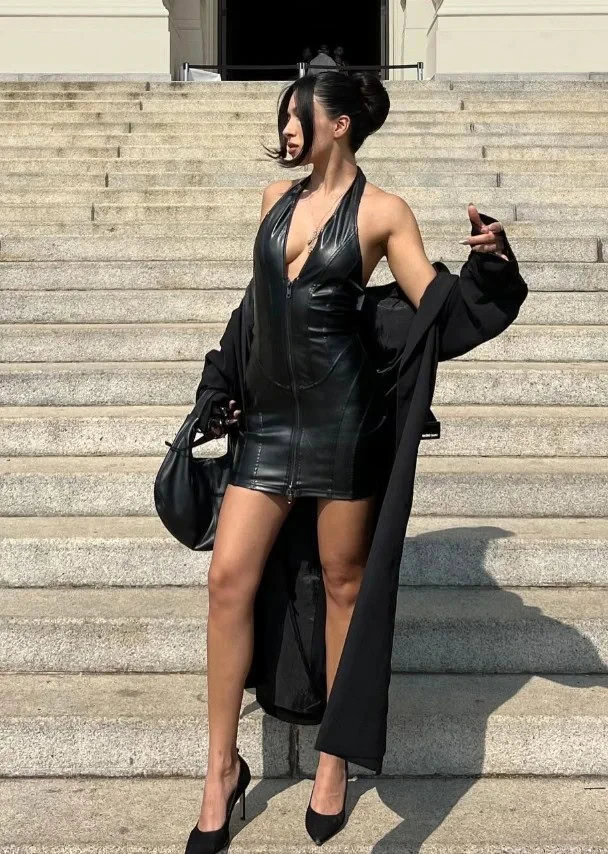 Elevate your baddie style with this ultra-chic ensemble that exudes confidence and edge. The figure-hugging leather mini dress with a plunging neckline serves as the centerpiece, creating a sultry silhouette that demands attention.