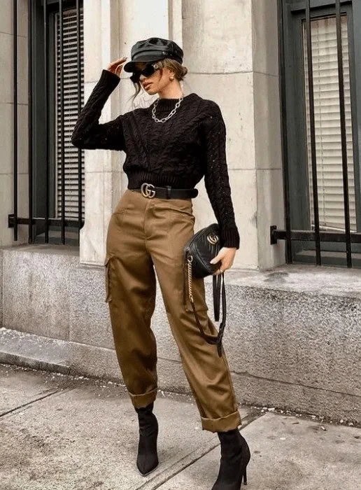 This outfit perfectly embodies the baddie aesthetic with its blend of streetwear and high-end elements. The black textured sweater paired with camel cargo pants creates a sophisticated yet edgy contrast.