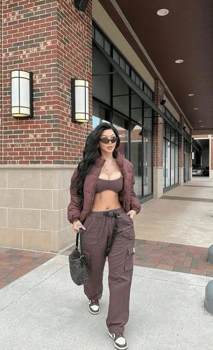 Completing the look are chunky beige sneakers and a matching tote bag, adding a touch of urban flair. This outfit demonstrates how effortlessly cool a baddie can look while prioritizing comfort, making it an ideal choice for various occasions from casual outings to low-key social events.
