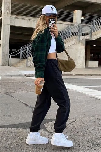 This outfit perfectly embodies the baddie aesthetic with its blend of sporty and street style elements. The combination of a cropped white top and oversized green plaid shirt creates a layered look thats both comfortable and fashion-forward.