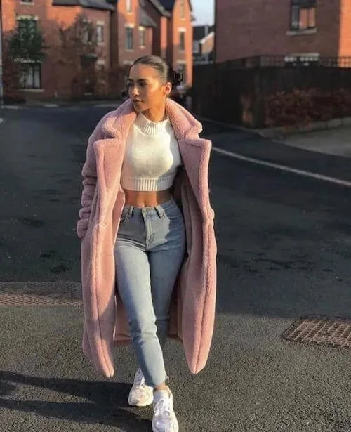 This baddie outfit effortlessly combines comfort and style, perfect for a chilly day out. The eye-catching pastel pink teddy coat adds a soft, feminine touch while providing warmth and making a bold statement.