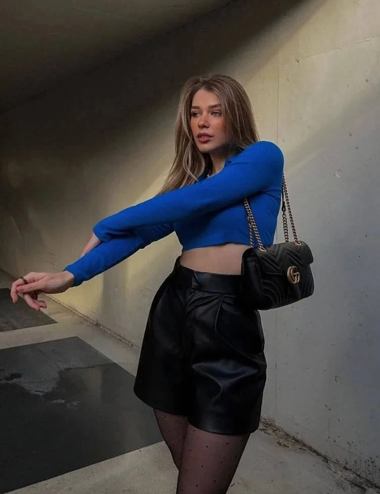 This outfit perfectly embodies the baddie aesthetic with its bold color contrast and sleek silhouette. The electric blue long-sleeved crop top adds a vibrant pop of color, while the high-waisted black leather skirt exudes edgy confidence.