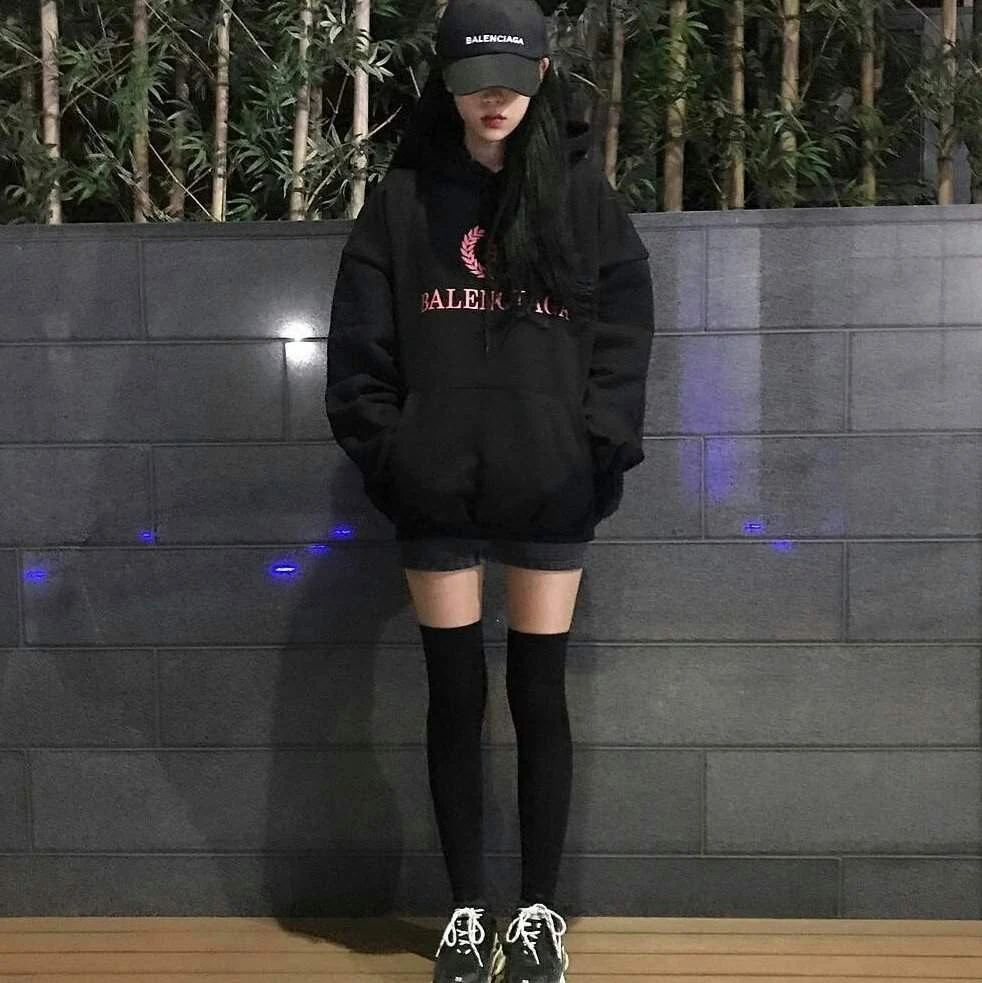 Paired with black shorts and thigh-high socks, the look creates a bold, leggy silhouette thats both daring and stylish. The Balenciaga cap ties the ensemble together, showcasing brand loyalty while providing an air of mystery.