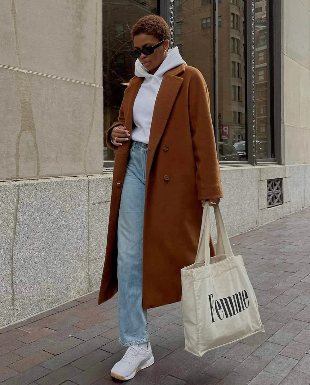This outfit epitomizes the effortlessly cool baddie aesthetic with its perfect blend of comfort and style. The long caramel coat adds a touch of sophistication, while the white hoodie underneath keeps things casual and trendy.