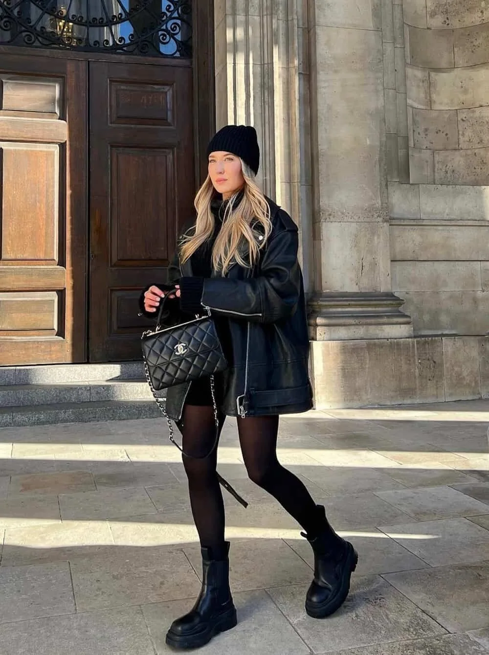 This outfit epitomizes the baddie aesthetic with its sleek, all-black ensemble that exudes confidence and urban sophistication. The oversized leather jacket adds a touch of edgy glamour, while the mini skirt and sheer tights create a perfect balance of sultry and street-smart.