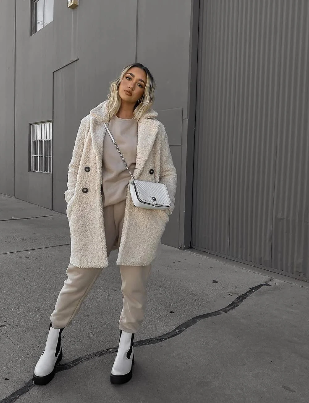 Paired with matching neutral separates, this look exudes sophistication and style. The white chunky boots offer a trendy contrast, while the quilted crossbody bag adds a hint of glamour.