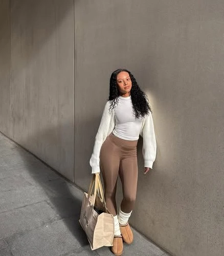 This outfit embodies the perfect balance of comfort and style that every baddie aspires to achieve. The ensemble features a crisp white turtleneck layered under a cozy, oversized cream cardigan, paired with sleek taupe leggings.