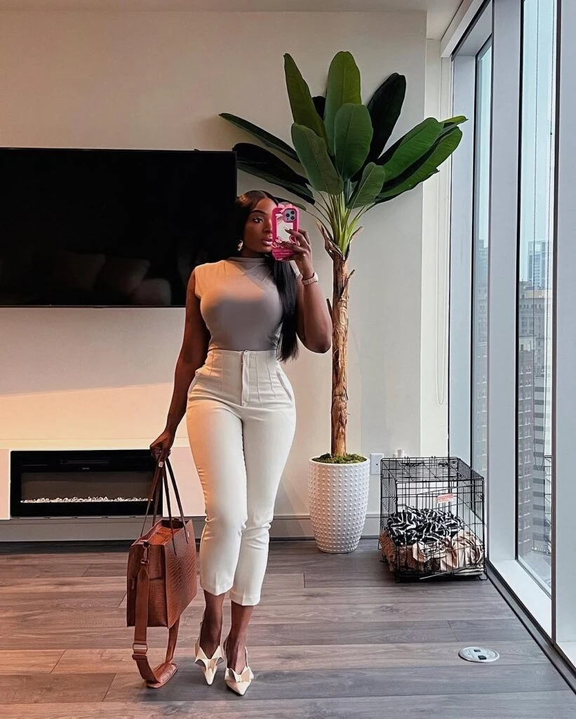 Pointed white heels add a touch of elegance, while the structured brown leather tote brings a polished finish to the outfit. This look is perfect for the confident baddie who commands attention in any room, from high-stakes business meetings to upscale social gatherings.
