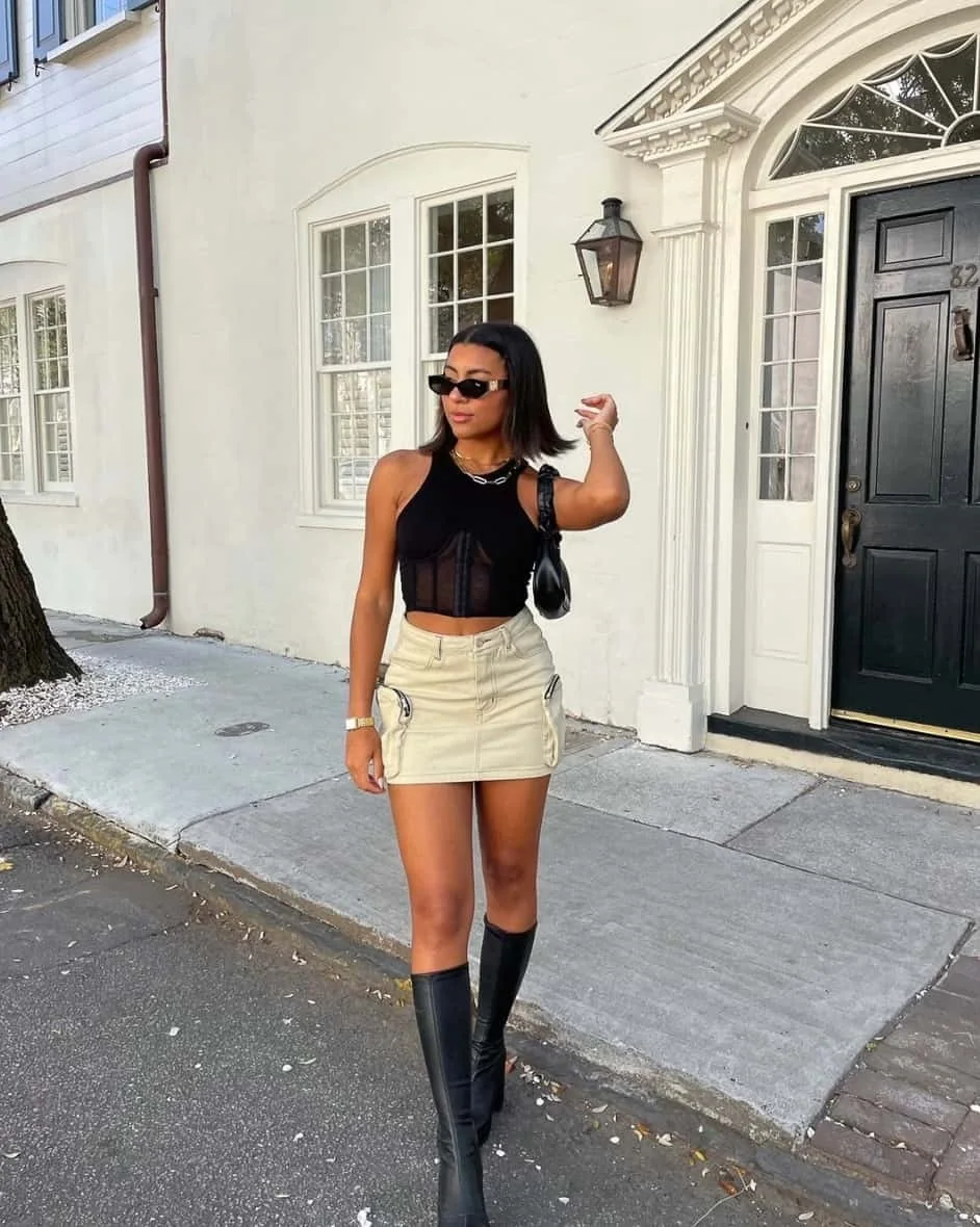 This outfit epitomizes the baddie aesthetic with its perfect blend of edgy and chic elements. The black sheer crop top adds a daring touch, while the beige mini skirt keeps the look balanced and versatile.