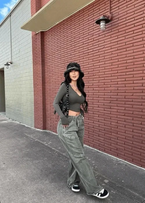 This outfit perfectly embodies the baddie aesthetic with a nostalgic Y2K twist. The combination of a cropped long-sleeve top and wide-leg cargo pants creates a balanced silhouette thats both comfortable and stylish.