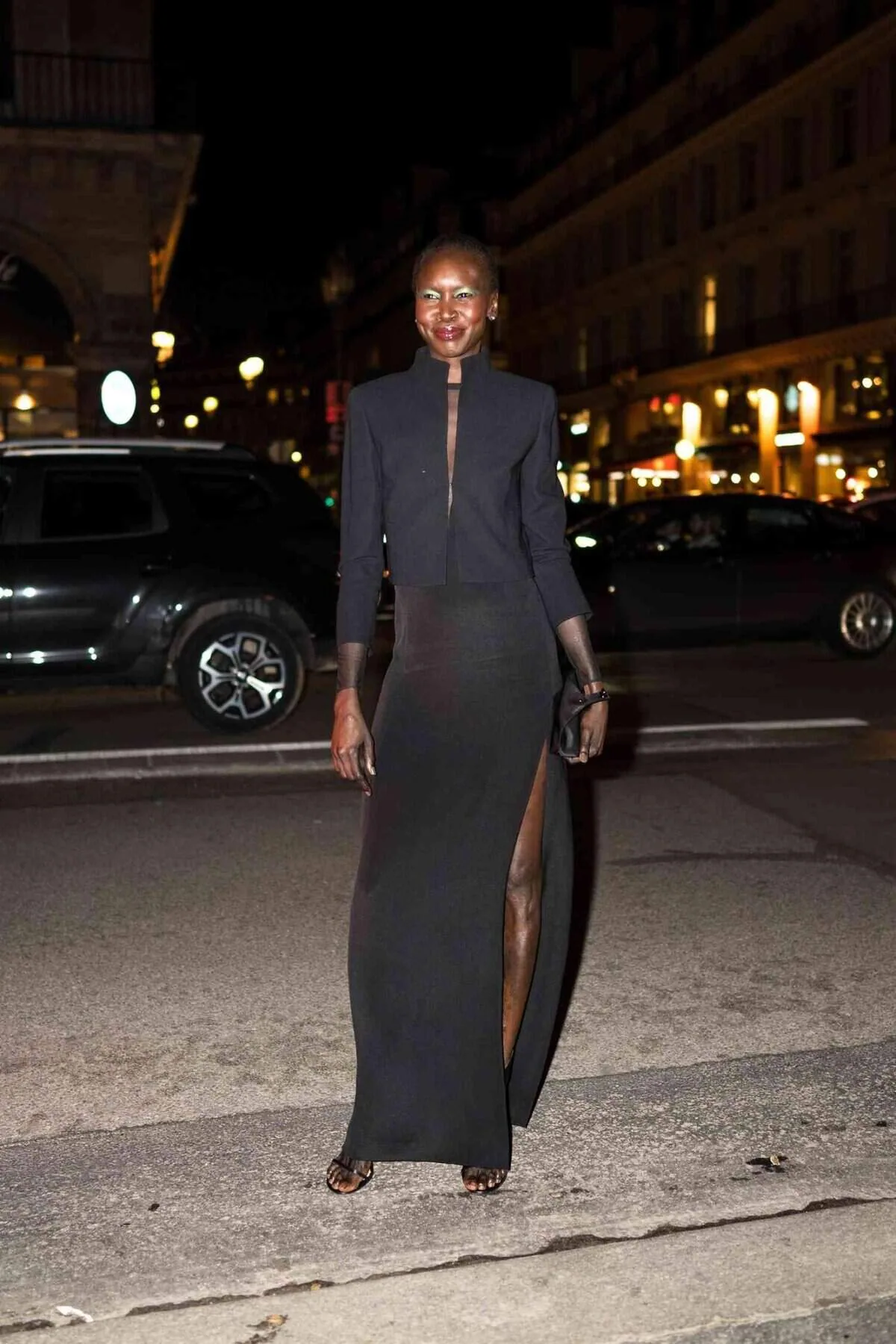 This stunning black ensemble exudes sophistication and allure, perfect for a memorable birthday celebration. The floor-length gown features a daring thigh-high slit, adding a touch of sensuality to the elegant silhouette.
