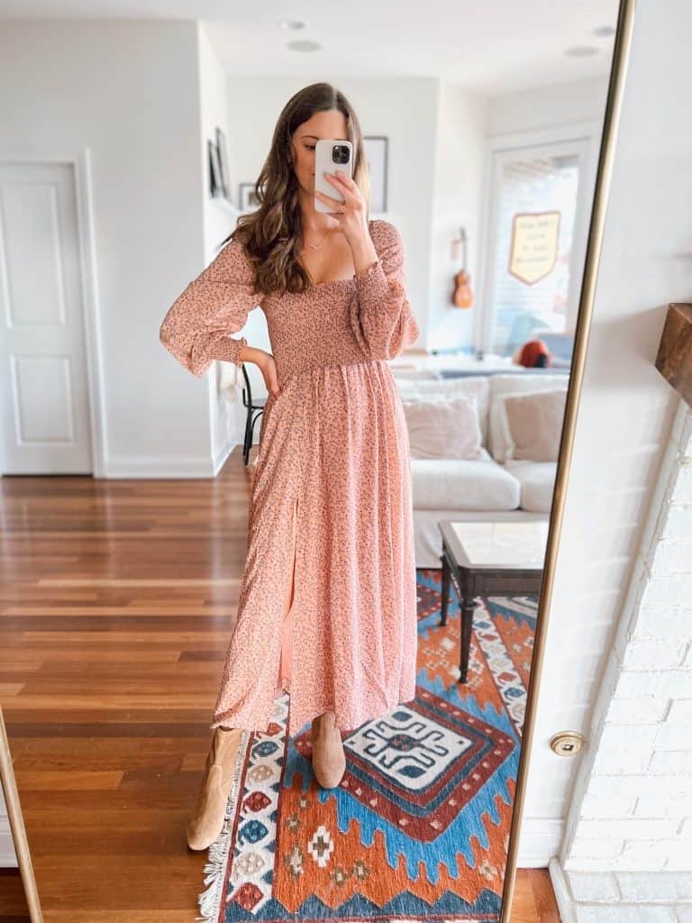 This enchanting blush-toned maxi dress exudes romantic elegance, perfect for a birthday celebration that calls for both comfort and style. The delicate floral print and soft hue create a feminine allure, while the smocked bodice ensures a flattering fit.