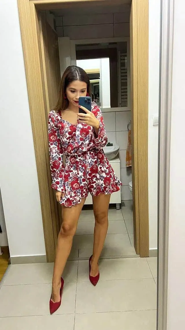Make a statement at your birthday dinner with this eye-catching floral romper. The vibrant red and white pattern exudes confidence and celebration, perfect for a special night out.