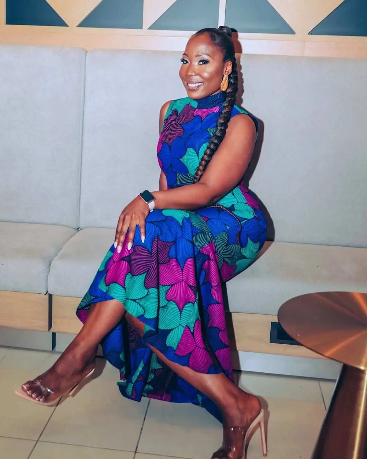 Paired with clear heels and gold accessories, this outfit exudes confidence and style. Its a perfect choice for those who want to celebrate their special day with a touch of African-inspired fashion, making it a unique and memorable addition to any birthday dinner ensemble.