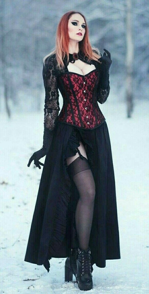 This enchanting ensemble perfectly embodies the whimsical goth aesthetic, blending dark romance with fairytale allure. The striking red and black lace corset forms the focal point, its intricate pattern reminiscent of thorny rose vines.