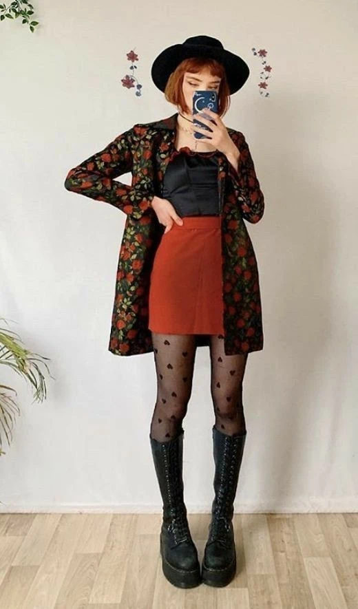 Paired with a rust-colored skirt and sheer polka dot tights, the ensemble strikes a balance between earthy charm and dark allure. The black wide-brimmed hat and chunky boots add a touch of classic goth style, while the delicate floral accents on the wall behind create an ethereal backdrop.