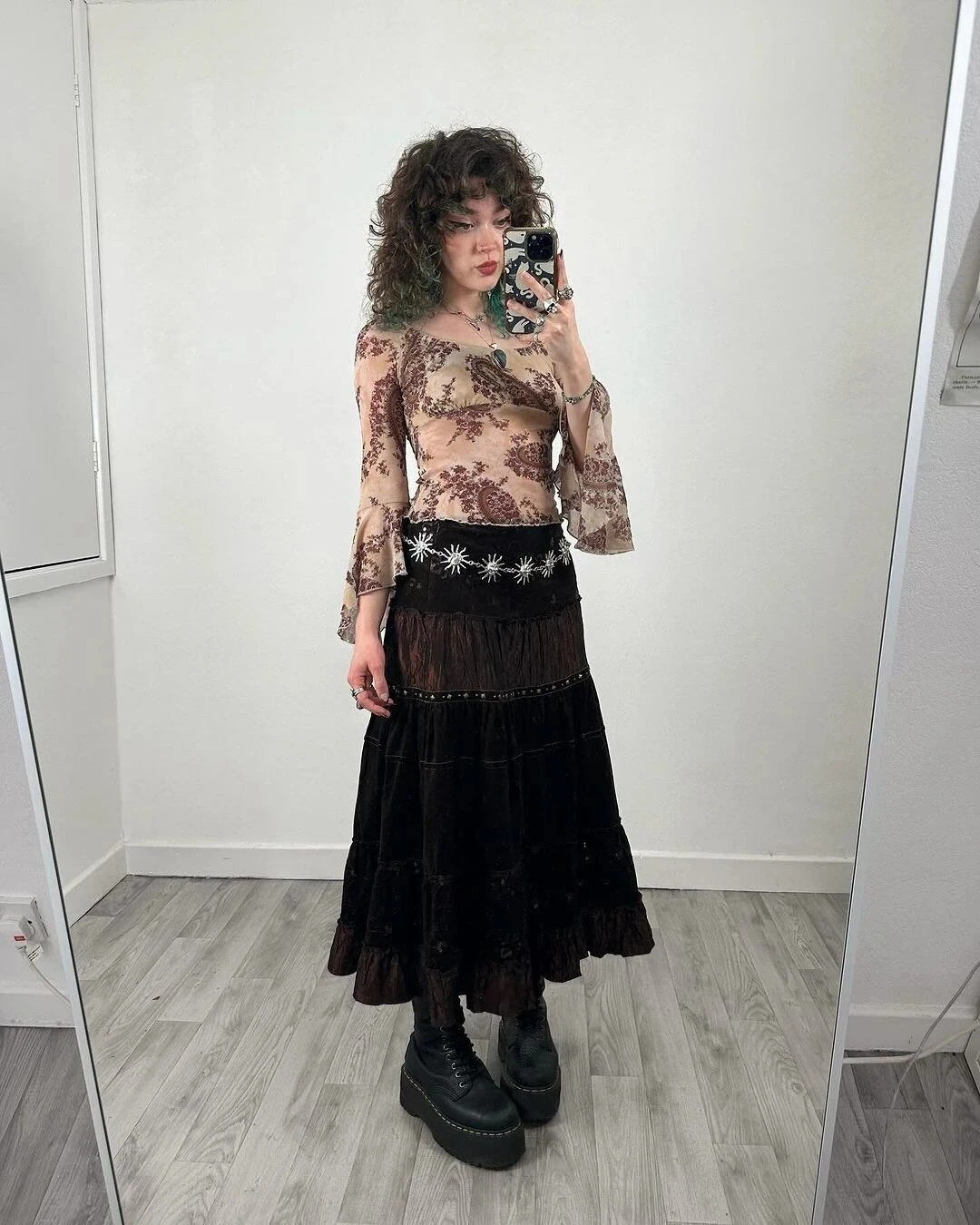 The lace-up brown boots provide a rugged, earthy contrast to the delicate top layers. Accessorized with layered necklaces and a statement belt, this outfit strikes a captivating balance between light and dark, soft and tough.