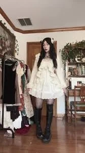 However, the dark elements add a captivating twist to the ensemble. Black thigh-high stockings and chunky platform shoes create a striking contrast against the ethereal dress, while the models long, dark hair and pale complexion complete the gothic aesthetic.
