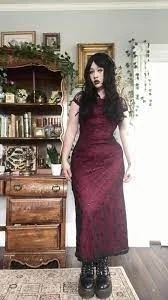 This enchanting ensemble embodies the essence of whimsy goth with its deep burgundy velvet gown, perfectly balancing elegance and dark fantasy. The floor-length dress hugs the figure, creating a silhouette reminiscent of Victorian-era fashion, while the rich color evokes thoughts of vintage wine and gothic romance.