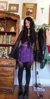 Step into a dark fairytale realm with this bewitching ensemble that perfectly embodies the whimsy goth aesthetic. A rich purple velvet dress serves as the magical foundation, its vibrant hue evoking images of twilight skies and mystical potions.