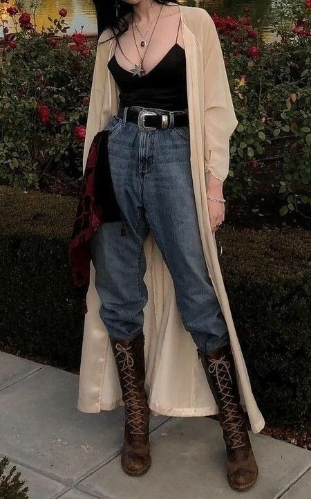 This ensemble perfectly embodies the whimsical goth aesthetic by blending ethereal elements with edgy grunge. The flowing cream-colored duster adds a touch of fairytale elegance, while the black camisole and distressed denim jeans ground the look in dark romanticism.