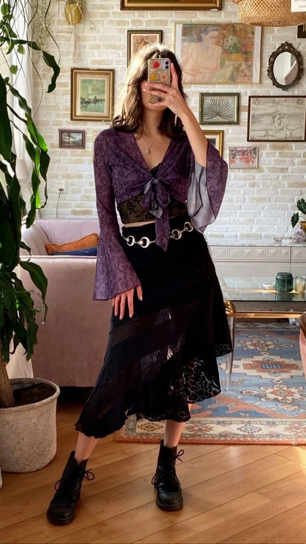 This ensemble embodies the essence of whimsical goth with a touch of bohemian flair. The deep purple velvet crop top with billowing sleeves creates an air of mystique, while the black lace midi skirt adds a romantic, ethereal quality.