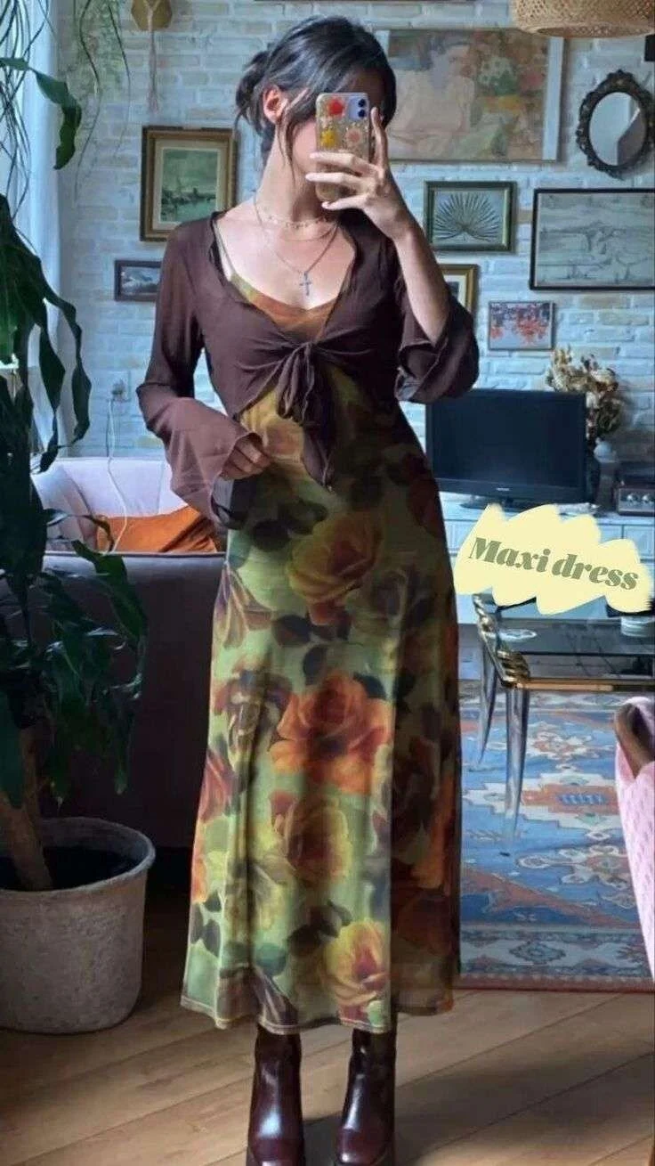 This enchanting ensemble perfectly embodies the whimsical goth aesthetic, combining dark romance with fairytale elegance. The floral maxi dress features a dreamy pattern of muted roses in earthy tones, creating a mysterious garden effect.