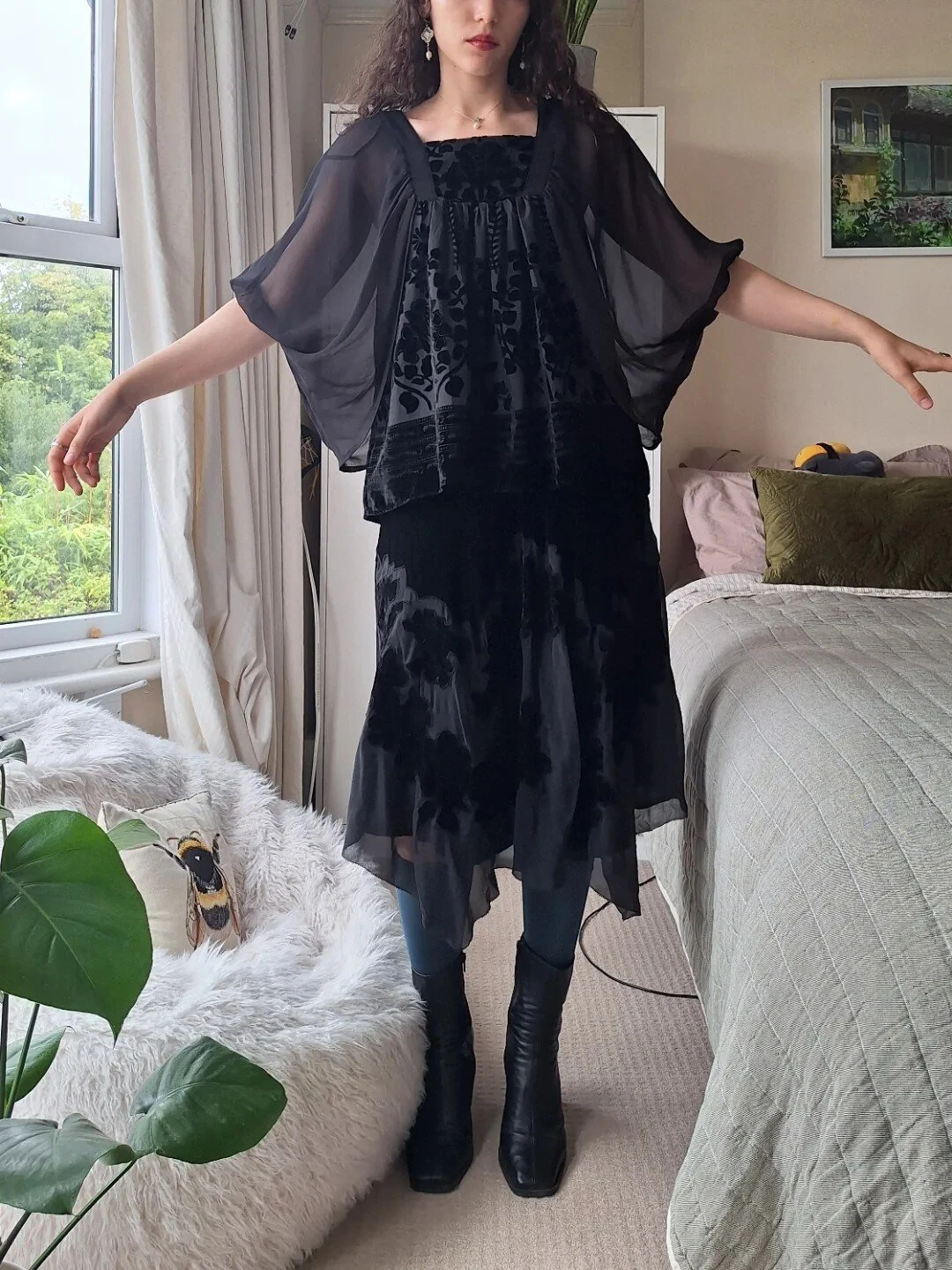 The eclectic backdrop of vintage artwork and lush plants enhances the magical atmosphere, making it easy to imagine this modern witch casting spells in her artsy, plant-filled sanctuary. This look seamlessly blends gothic elements with whimsical details, creating an enchanting aesthetic thats perfect for unleashing your dark fairytale fantasies.