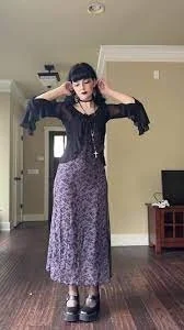 This enchanting outfit perfectly embodies the whimsical goth aesthetic, blending dark romanticism with fairytale-like charm. The foundation of the look is a flowing, ankle-length skirt in a delicate lavender hue, adorned with intricate lace patterns that evoke a sense of vintage elegance.