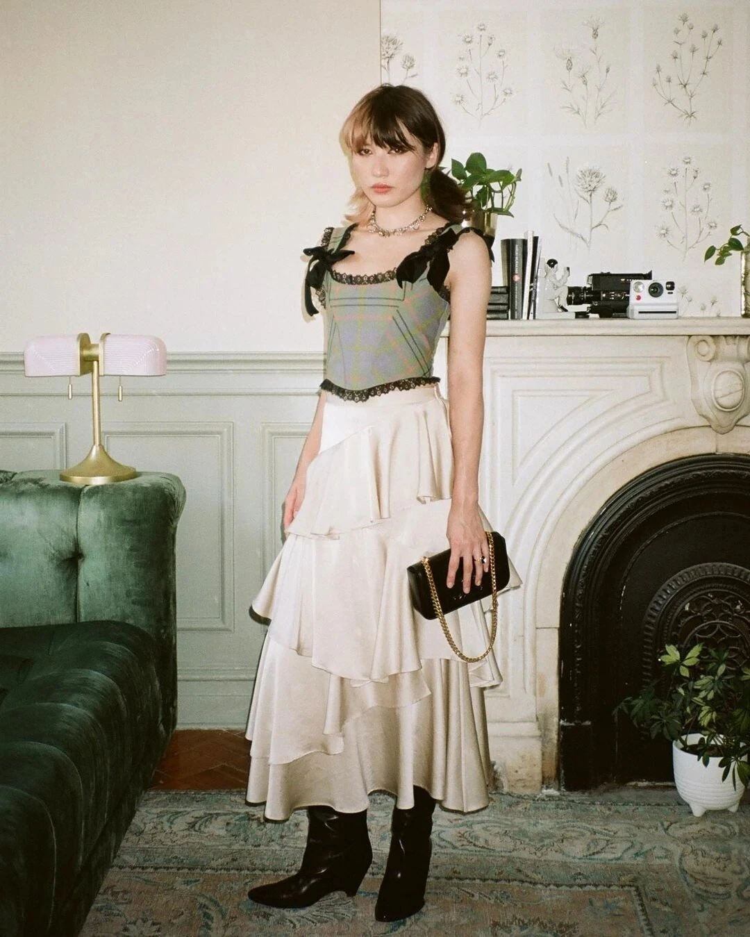 Paired with chunky black boots, the outfit strikes a harmonious chord between classic and contemporary. The backdrop of antique furniture and bookshelves adds to the mysterious allure, transporting us to a realm where dark fairytales come to life.