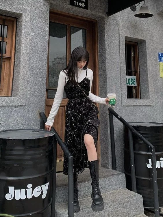 This enchanting ensemble perfectly embodies the whimsical goth aesthetic, combining darkness with a touch of fairytale charm. The star-studded black slip dress creates a dreamy, celestial vibe, while the white long-sleeved top underneath adds a layer of mystery and allure.