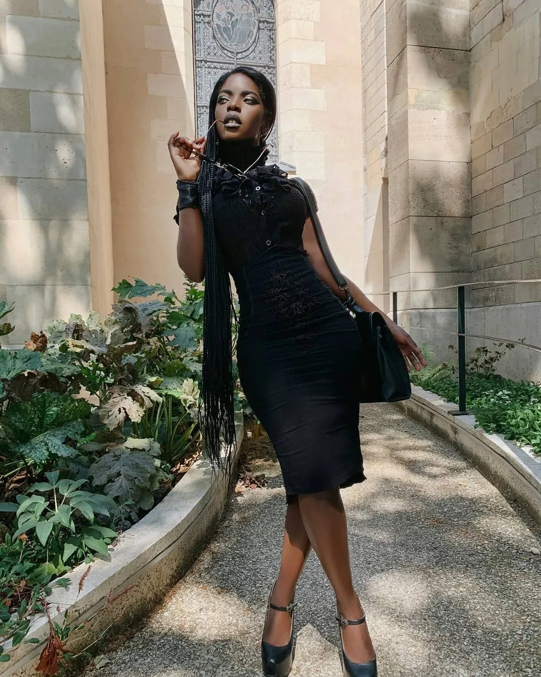 The long, flowing braids add a magical, fairytale-like quality to the look, while the metallic accessories including a delicate necklace and anklet provide a hint of otherworldly shimmer. Set against the backdrop of ornate architecture and lush greenery, this outfit perfectly captures the balance between darkness and enchantment that defines whimsy goth style.
