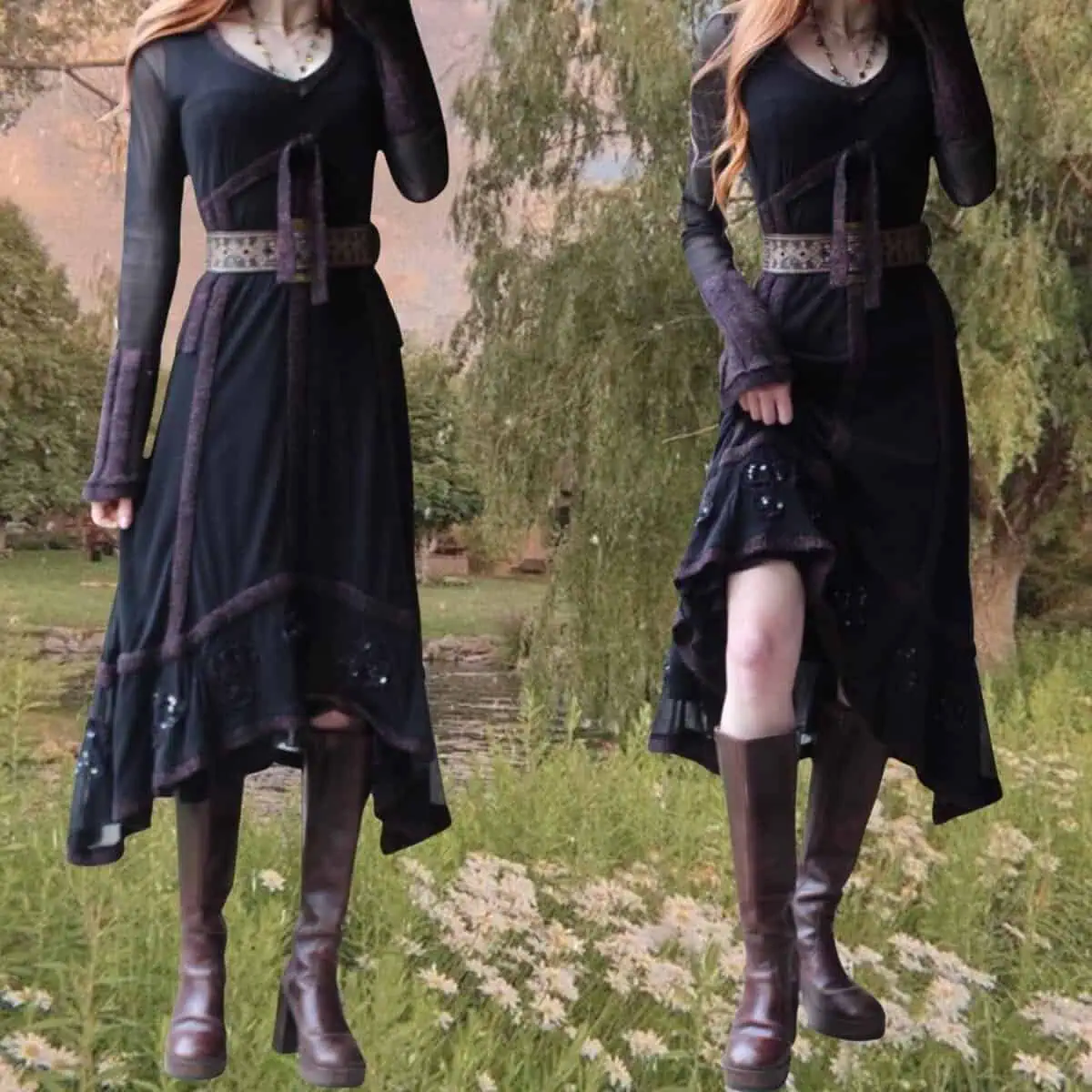 Long bell sleeves and a high-low hemline add drama and movement, while the v-neckline and sheer details infuse a touch of allure. Paired with tall brown boots, this outfit is ready for a moonlit stroll through an enchanted forest.