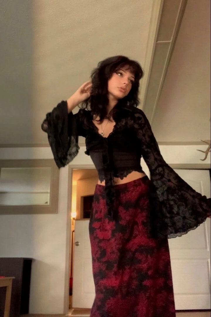 This enchanting ensemble epitomizes the whimsical goth aesthetic, blending dark romance with fairytale allure. The delicate black lace crop top, adorned with dramatic bell sleeves, creates an ethereal silhouette reminiscent of a woodland sprite.