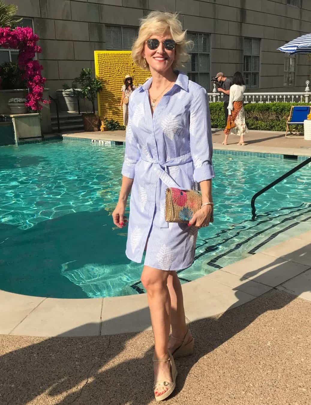 Elevate your fall party style with this versatile light blue shirtdress, perfect for those warm autumn days by the pool. The crisp, collared silhouette offers a polished look, while the belted waist adds a flattering touch. Paired with neutral wedge sandals and a vibrant straw clutch, this ensemble seamlessly transitions from day to evening events. Accessorize with statement sunglasses and delicate jewelry to complete the sophisticated yet relaxed vibe. This outfit proves that fall fashion isn’t just about layers – it’s about adapting summer staples for cooler seasons with grace and style.
