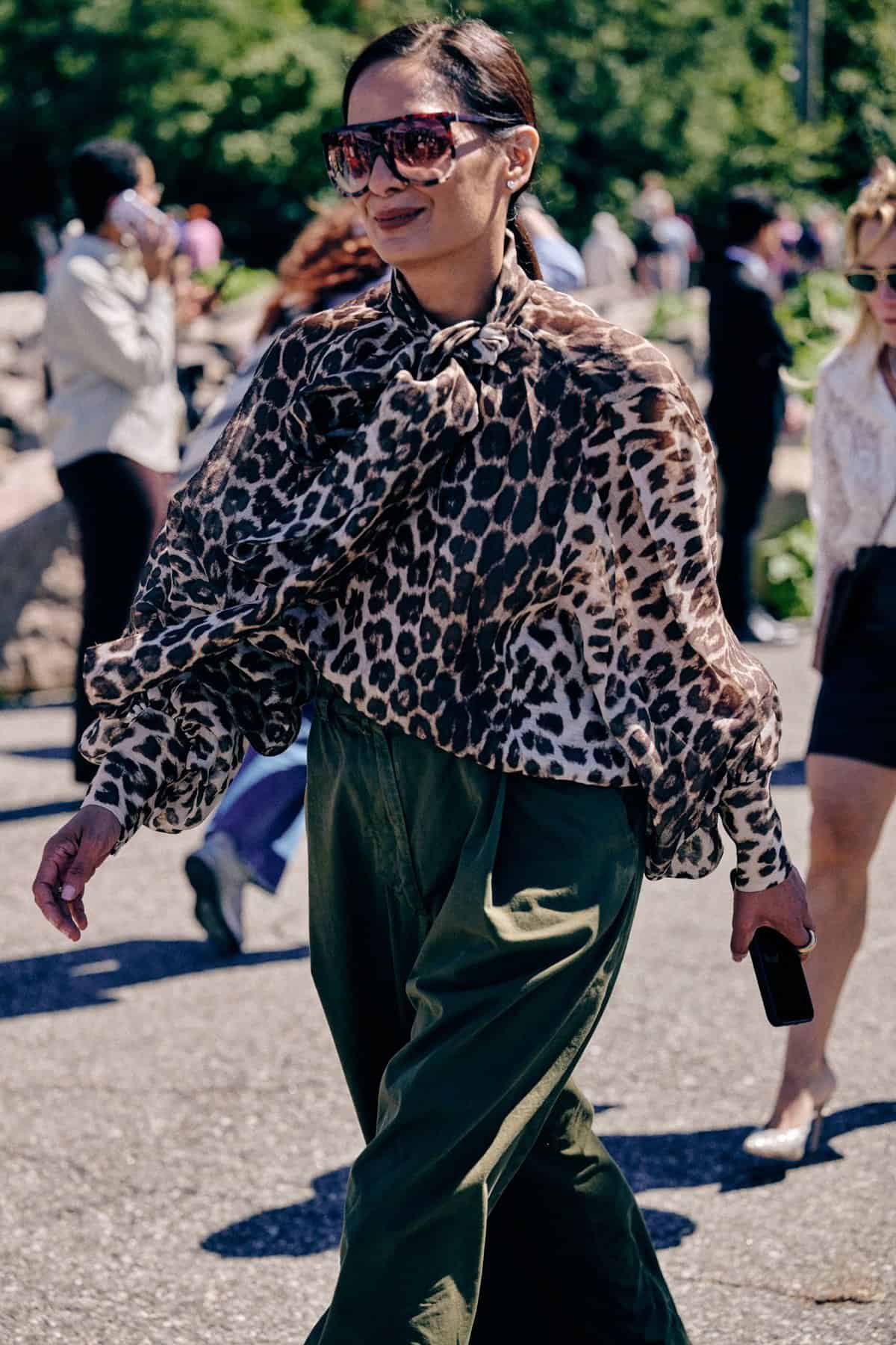 Make a bold statement this fall with a striking combination of leopard print and rich emerald green. This outfit showcases a luxurious leopard print blouse with voluminous sleeves, paired expertly with flowing emerald green trousers. The contrast between the wild animal print and the deep jewel tone creates a sophisticated yet daring look perfect for any autumn soirée. Accessorize with oversized sunglasses and a sleek hairstyle to elevate the ensemble further. This outfit effortlessly balances trendy and timeless elements, ensuring you’ll turn heads at your next fall gathering while staying comfortably chic.