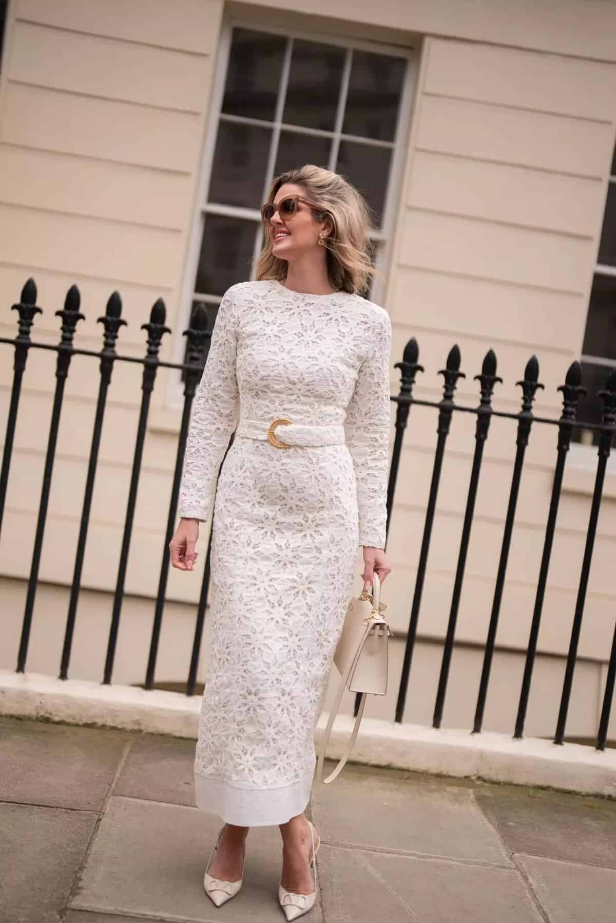 Make a stunning entrance at your fall soirée with this sophisticated white lace maxi dress. The long-sleeved, form-fitting silhouette exudes timeless elegance, while the intricate lace pattern adds a touch of romance perfect for the season. Cinched at the waist with a gold-accented belt, this dress creates a flattering hourglass shape. Paired with neutral accessories like cream-colored pumps and a matching handbag, this ensemble offers a fresh take on fall fashion. The maxi length provides warmth for cooler evenings, making it an ideal choice for outdoor autumn gatherings. This show-stopping outfit will undoubtedly turn heads and set you apart as the epitome of fall party chic.